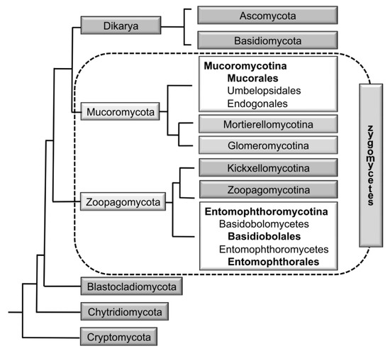 - Benny, G.L.; Smith, M.E.; Kirk, P.M.; Tretter, E.D.; White, M.M. Challenges and future perspectives in the systematics of Kickxellomycotina, Mortierellomycotina, Mucoromycotina, and Zoopagomycotina. In Biology of Microfungi; Springer: Berlin, Germany, 2016; pp. 65–126. [Google Scholar] [CrossRef]
