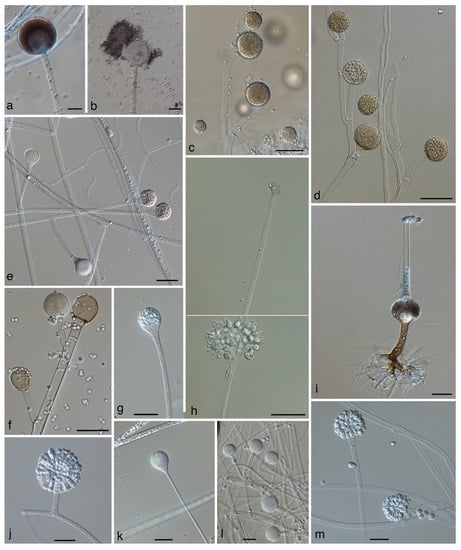 Morphology of the opportunistic members of the Mucorales. (a) Sporangiophore with sporangium and indistinct apophysis and (b) with columella and detached sporangiospores of Rhizopus arrhizus JMRC:NRZ:1217; (c) sympodially branched sporangiophore of Mucor circinelloides NRZ-2019-468; (d) sympodially branched sporangiophore of Mucor ramosissimus CBS 135.65; (e) sporangiophore with columellae and detached sporangiospores of Lichtheimia ramosa NRZ-2019-435; (f) sporangiophore with columellae and detached sporangiospores of Rhizomucor pusillus JMRC:NRZ:0496; (g,k) sporangiophores of Apophysomyces variabilis; (h) sporophore with sporangiola and columella at the place of the former sporangium of Thamnostylum lucknowense JMRC:SF:00845; (i) sporophore of Saksenaea sp.; (j) sporophore with merosporangia of Syncephalastrum racemosum CBS 302.65; (l) young sporangiophore of Actinomucor elegans CBS 111556; (m) sporophores with single-spored sporangiola of Cunninghamella bertholletiae. Scale bars = 50 µm.