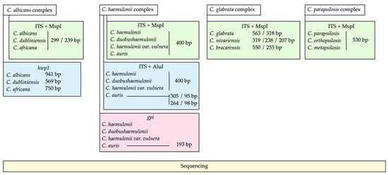 Flow diagram for the identification of cryptic species within four complexes of the genus Candida by molecular methods.