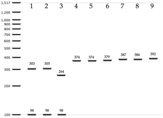Because the species of the C. haemulonii complex cannot be identified by amplification of the ITS region and digestion with MspI, a simple method was designed to differentiate C. auris from other species phylogenetically related to the C. haemulonii complex: C. haemulonii, C. haemulonii var. vulnera, C. duobushaemulonii, C. pseudohaemulonii, C. ruelliae, and C. heveicola [23]. The ITS region was amplified for subsequent digestion with the restriction enzyme AluI. To assess whether the restriction target for AluI was a conserved site, sequences available in NCBI of each of the seven species were analyzed. DNA sequences of C. haemulonii complex species isolated from countries on four continents were obtained (Americas, Europe, Asia, and Oceania). According to the in silico analysis (Figure 2), C. auris exhibited one or two restriction targets for the AluI enzyme and generates a two- or three-band restriction profile (305/95 bp; or 264/98/36 bp), while the rest of the species showed a single-band pattern between 374 and 392 bp. The amplification conditions were the same as described in the Section 2.2. Ten microliters of the amplification products of the ITS region were digested in a volume of 20 µL, with 0.5 µL of the AluI enzyme (10 U/µL), 2 µL of buffer, 17.3 µL of water, and 0.2 µL of acetylated bovine serum albumin (BSA) (10 µg/µL) for 2 h at 37 °C. A previously characterized strain of C. auris was used as a control in all assays.