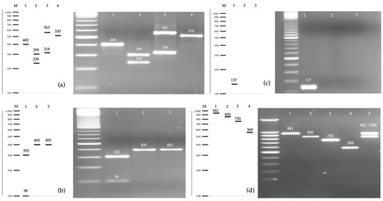 In silico analysis and amplification profiles of four molecular methods for the identification of Candida species. (a) PCR of the ITS region of rDNA digested with MspI. Lane 1: C. haemulonii complex, Lane 2: C. albicans complex, Lane 3: C. glabrata sensu stricto, Lane 4: C. parapsilosis complex; (b) PCR of the ITS region of rDNA digested with AluI for identification of C. auris within the C. haemulonii complex. Lane 1: C. auris, Lanes 2,3: C. haemulonii; (c) PCR of the gpi gene for identification of C. auris within the C. haemulonii complex. Lane 1: C. auris, lanes 2,3: C. haemulonii; (d) PCR of the hwp1 gene for identification of species within the C. albicans complex. Lane 1: C. albicans sensu stricto hwp1-1, Lane 2: C. albicans hwp1-2, Lane 3: C. africana, Lane 4: C. dubliniensis, Lane 5: heterozygous isolate showing a two-band profile hwp1-1/hwp1-2.