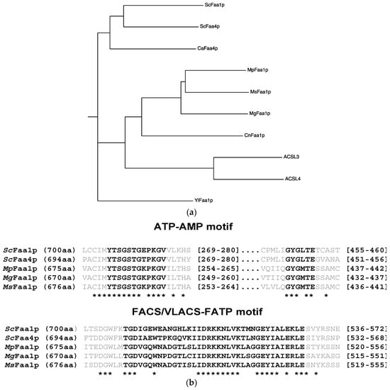 Phylogenetic tree of ACS enzymes in S. cerevisiae and Malassezia spp. (a) Phylogenetic tree of Faa1 proteins in various fungi, constructed using ClustalW and drawn using Phylodendron’s phenogram (http://iubio.bio.indiana.edu/treeapp/treeprint-form.html). MpFaa1p: Malapachy_0054; MgFaa1p: MGL_3626; MsFaa1p: MSYG_3835; CaFaa4p: Candida albicans Faa4; CnFaa1p: Cryptococcus neoformans Faa1; YlFaa1p: Yarrowia lipolytica Faa1; ACSL3: human long-chain fatty acid–CoA ligase 3; ACSL4: human long-chain fatty acid–CoA ligase 4. Scale bar denotes 0.1 substitutions per site. (b) Amino acid sequence alignment of Faa1p in S. cerevisiae and M. globosa, M. pachydermatis, and M. sympodialis, showing the ATP–AMP motif and FACS/VLACS motif in bold letters. * indicating similar amino acid in all protein aligned in this study. Multiple sequences were aligned using T-Coffee (http://tcoffee.crg.cat/apps/tcoffee/do:regular). Asterisks denote amino acids conserved in all proteins aligned.