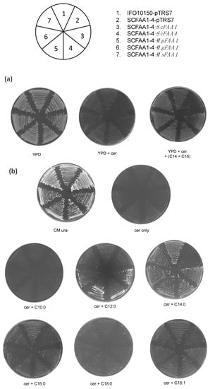 Strains of S. cerevisiae used in this study are listed in Table S1. S. cerevisiae strains IFO10150 and faa1faa4 mutant (SCFAA1-4) were cultured in YPD medium (2% glucose, 2% peptone, and 1% yeast extract) and grown at 30 °C in CM ura− medium (0.67% yeast nitrogen base without amino acids (Difco), 0.12% uracil drop-out [29]) containing different fatty acids (C10:0, C12:0, C14:0, C16:0, C18:0, and C18:1) at 0.5 mM and 5 μg/mL cerulenin (Wako, Japan). Most chemicals used for media preparation were purchased from Nacalai Tesque Inc. (Kyoto, Japan).