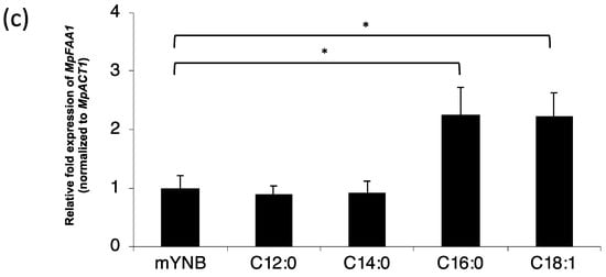 We also analyzed the transcription of MpFAA1 in M. pachydermatis cultured in mYNB medium with several different fatty acids. Expression of the MpFAA1 gene in medium containing C16:0 and C18:1 was enhanced approximately 2-fold compared with cells grown in mYNB medium only. These data indicated that MpFAA1 expression was induced by addition of at least C16:0 and C18:1 (Figure 2c).