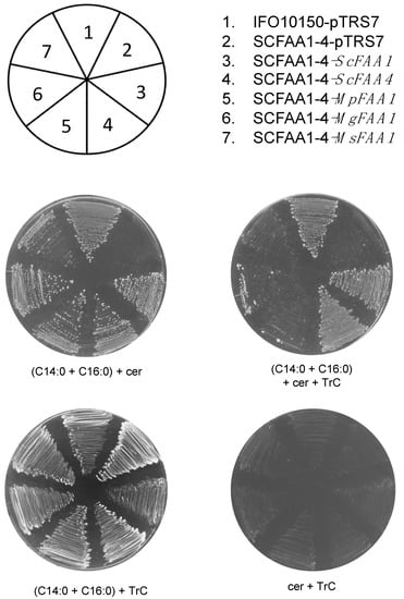 Triacsin C is known as an inhibitor of bacterial and mammal ACSs [23,24]. To investigate the effect of triacsin C on Malassezia Faa1p, SCFAA1-4 strains expressing MpFAA1, MgFAA1, and MsFAA1 were cultivated in a medium containing cerulenin, LCFAs, and triacsin C. Triacsin C blocked the rescue of Malassezia Faa1 proteins in the SCFAA1-4 mutants. In contrast, the growth of S. cerevisiae IFO10150 and SCFAA1-4 strains expressing ScFAA1 and ScFAA4 was not affected by triacsin C (Figure 3). These data suggested that triacsin C inhibits the activity of Malassezia Faa1 proteins, not ScFaa1 and ScFaa4 proteins.