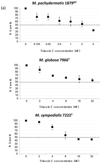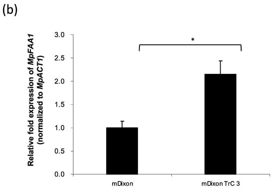 (a) Inhibition of the growth of M. pachydermatis 1879NT, M. globosa 7966T, and M. sympodialis 7222T by triacsin C. All the three Malassezia strains were grown at 32 °C in mDixon liquid medium supplemented with triacsin C in a 96-well plate with a starting OD600 of 0.1. After 48 h, the OD was measured at 600 nm using a microplate reader (n > 3 experiments, each done in triplicate). (b) M. pachydermatis 1879NT was grown in mDixon liquid medium until early/mid-log phase, transferred to a fresh liquid mDixon medium containing 3 μM triacsin C, and incubated for 6 h at 32 °C. RNAs were extracted, reverse transcribed to cDNAs, and then assayed to determine gene expression levels relative to the expression of MpACT1 using qRT-PCR analysis (n = 3 independent experiments, each done in duplicate; * p < 0.05).