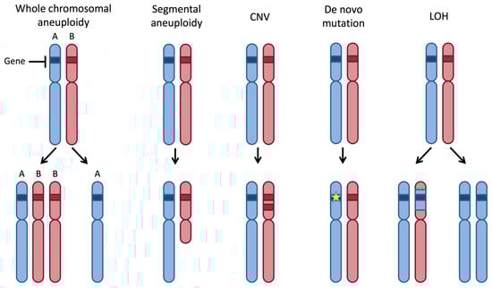 A frequent cause of genomic variation is due to changes in gene dosage. These can occur due to copy number variants (CNVs) arising from insertions, deletions or amplifications of segments of the genome (Figure 1). Expression profiling reveals that the gene copy number often, but not always, correlates with gene expression in yeast, mammals and plants [,,,], with notable exceptions being animal sex chromosomes where dosage compensation mechanisms may apply []. Changes in gene dosage can also occur on a chromosomal scale due to aneuploidy, where an abnormal complement of chromosomes is present in the cell (Figure 1). Gene dosage variation can drive genome evolution, but is also associated with sporadic and Mendelian diseases in humans [].