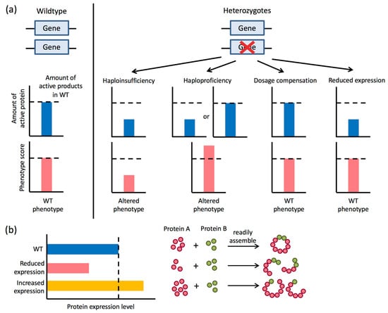 Figure 2. Potential phenotypic outcomes in diploid heterozygotes. (a) Loss of one allele of a gene will result in alternative outcomes including haploinsufficiency, haploproficiency and dosage compensation. Haploinsufficiency causes fitness defects, which often constitute a recessive phenotype associated with reduced gene expression. Haploproficiency occurs when one functional allele generates the opposite phenotype of the null mutant, and can be due to either increased or decreased protein levels. Heterozygous cells can also show a normal phenotype, either because reduced gene expression does not produce a phenotype or due to dosage compensation. (b) Changes in gene expression are particularly likely to impact phenotypes when the gene product is part of a larger protein complex, as this can cause an imbalance in subunit stoichiometry. WT, wildtype.