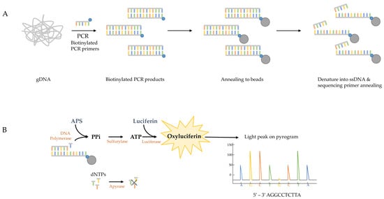 The pyrosequencing method is based on the ‘sequencing-by-synthesis’ principle and is widely used to detect epigenetic modifications in malignant cells and microbes but also to discover biomarkers [126,127]. The method relies on the detection of light that is released during nucleotide incorporation into the amplifying DNA (Figure 1). The first step in the assay for the detection of azole-resistant cyp51A genotypes of A. fumigatus, is to obtain the template DNA by PCR amplification of target gene fragments using genomic A. fumigatus DNA or patient respiratory samples. The sense strand must be labelled with 5′ biotin as biotinylated PCR products will bind to the streptavidin–sepharose beads and—since only one strand carries biotin—this promotes the generation of ssDNA template [128,129]. Once the ssDNA fragments are immobilized, the sequencing primer needs to be annealed to the template ssDNA and the pyrosequencing reaction can begin (Figure 1A). During the pyrosequencing reaction, pyrophosphate is released when a nucleotide is incorporated to the growing dsDNA product and is converted by sulfurolyase into ATP, which is then utilized by luciferase to produce light (Figure 1B). Nucleotides are added sequentially to the enzymes- and substrates mixture and, therefore, the sequence can be read as the reaction proceeds. The light peak on the pyrogram is proportional to the number of incorporated nucleotides. After every cycle, the enzyme apyrase degrades the excess nucleotides and regenerates the reaction solution for the next nucleotide [130], which can be added in a known order corresponding to the nucleotide sequence of the region or in an arbitrary, repeated order. Single point mutations can be identified by comparing the pyrogram of the synthesised DNA with that of the reference DNA. To summarise, completing one pyrosequencing run includes DNA extraction of the clinical sample, followed by PCR amplification of the four target gene fragments and ends with the pyrosequencing reactions of biotinylated PCR products (Figure 2).