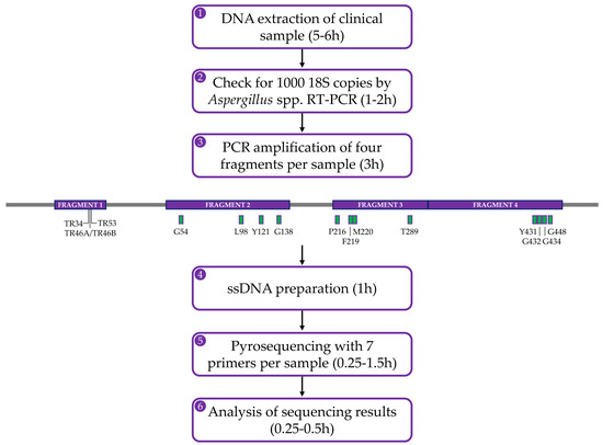 Flowchart of the in-house pyrosequencing-based method showing the steps that are involved to complete one pyrosequencing experiment. The initial steps (1–3) to enable pyrosequencing require the detection of ample A. fumigatus genomic DNA. The cyp51A gene, including 550 bases upstream and 58 bases downstream of the ORF, is targeted as four fragments (from 235–427 bp in length) by endpoint PCR using biotinylated primers as shown in purple in the gene diagram (modified with SnapGene software from GSL Biotech; available at snapgene.com). TR sites are specified in fragment 1 and SNPs associated with resistance (green boxes) are indicated in fragments 2–4. Following confirmation of successful amplification, PCR products are processed (steps 4–5) using the PyroMark Q24 Advanced instrument, kit and accessories (Qiagen, GmBH, Hilden, Germany). Each fragment comprises at least two hotspots (or insertion in the case of the 5′ upstream fragment) which is sequenced individually. Pyrograms are analysed (step 6) manually against a reference A. fumigatus strain sequence.