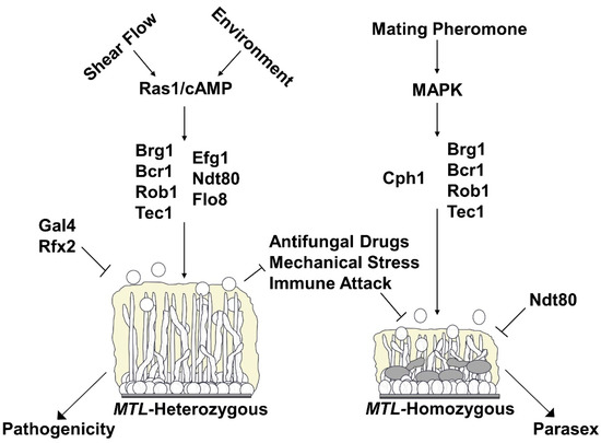 - Huang, G. Regulation of phenotypic transitions in the fungal pathogen Candida albicans. Virulence 2012, 3, 251–261. [Google Scholar] [CrossRef] [PubMed]