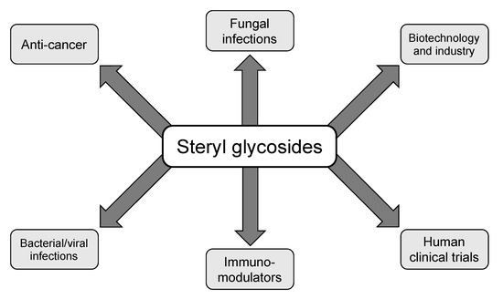There have been several biotechnological advancements using the SG metabolism enzymes, but not SGs themselves. These advancements span the food industry, agriculture, medicinal, and crystallization assays [6,72,73,80,85,86,87]. Three important studies showed the importance and uses of SGs in these fields. First, since SGs are made in such small amounts in cells, a means to mass produce will possibly be needed in the future, especially if our hypothesis regarding SGs as an immunoadjuvant holds true. One 2016 study reported the biochemical characterization of a steryl glycosyltransferase enzyme from the bacteria Micromonospora rhodorangea ATCC 31,603 [85]. This was a unique characterization since this SGT enzyme preferred phytosterols (plant sterols including sitosterol, stigmasterol, and campesterol) to cholesterol when making SGs. Since phytosterols are a common component of several other cosmetic and medicinal treatments, these enzymes have uses in the applied and biotechnological arm of science.