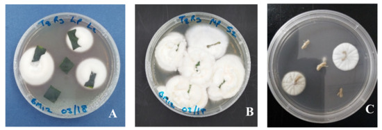 Endophytic Beauveria bassiana (BB Fafu-12) re-isolation from the citrus plant tissues. (A) Leaf, (B) stem, and (C) root tissues following foliar treatment with fungal conidia suspension.