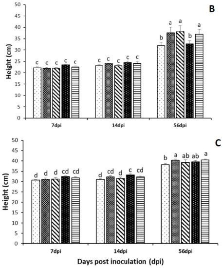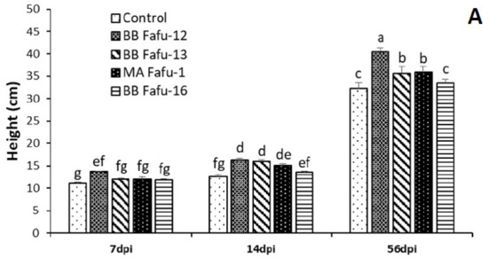 Mean (± SE) plant height of citrus seedlings at 7, 14, and 56 days post-inoculation (dpi) with entomopathogenic fungal strains (BB Fafu-12, BB Fafu-13, MA Fafu-1, and BB Fafu-16) or sterile distilled water containing 0.1% Tween 80 (Control). (A–C) are showing the height of citrus seedlings treated at 3, 4, and 6 months post-planting, respectively. Bars (± SE) with different letters indicate significant differences among treatments at p < 0.05 (LSD after a two-way ANOVA).