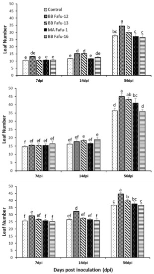 Mean (± SE) leaf number of citrus seedlings at 7, 14, and 56 days post-inoculation (dpi) with entomopathogenic fungal strains (BB Fafu-12, BB Fafu-13, MA Fafu-1, and BB Fafu-16) or sterile distilled water containing 0.1% Tween 80 (Control). (A–C) are showing the mean leaf number of citrus seedlings treated at 3, 4, and 6 months post-planting, respectively. Bars (± SE) with different letters indicate significant differences among treatments at p < 0.05. (LSD after a two-way ANOVA).