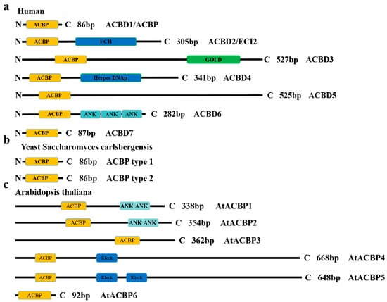 Figure 1. Schematic of key sequence domains of ACBP family proteins in humans, yeast S. carlsbergensis, and A. thaliana. All ACBP family proteins contain the ACBP domain, which binds to acyl-CoA ester. (a) There are seven kinds of ACBP family proteins in humans; (b) two kinds in yeast S. carlsbergensis; and (c) six kinds in A. thaliana.