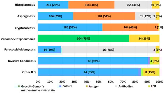 Histoplasmosis and aspergillosis were the IFD that involved a greater number of laboratory assays to reach their diagnosis. Immunological assays, detection of antigens and antibodies, were the most frequently assays involved. It is important to emphasize that depending on the disease clinical form, these assays can reach sensitivity values greater than 90% [27,28,29,30].