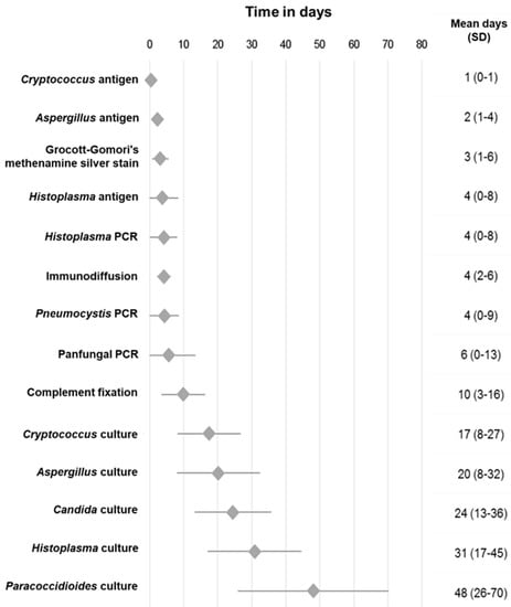 Result turnaround time and their respective standard deviations are summarized in Figure 2, where it is noted that antigen detection assays for Cryptococcus, Histoplasma, and Aspergillus yielded results in less time (<24 h to 4 days) in contrast to fungal cultures, which was the assay that required the most time to generate results, according to isolated microorganism, with a turnaround time for results that ranged between 17 and 48 days (Figure 2).