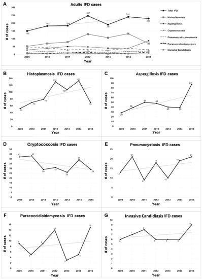 Figure 3. Annual cases of Invasive fungal diseases (2009–2015): (A) All Invasive fungal diseases (IFD). Breaking this down individually by IFD: (B) histoplasmosis cases; (C) aspergillosis cases; (D) cryptococcosis cases; (E) pneumocystosis cases; (F) paracoccidioidomycosis cases; (G) invasive candidiasis cases.