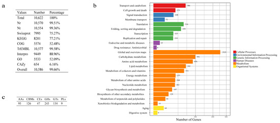 Of the 10,622 predicted genes, a total of 10,586 genes (99.66%) were functionally annotated by 9 databases (Figure 2a). In KEGG annotation result, 8201 genes (77.21%) were annotated and classified into 130 pathways belonging to 24 Level2 (Figure 2b). For COG functional annotation, 5574 genes (52.48%) were annotated to the 24 COG categories (Figure S3a). The most abundant cluster was related to the metabolism, including “amino acid transport and metabolism” and “carbohydrate transport and metabolism”. Further, 5533 genes were classified according to the GO database, in which 8359, 8025 and 5679 genes were annotated to “cellular component”, “biological process” and “molecular function”, respectively. The “catalytic activity” was the largest annotated GO term (Figure S3b).
