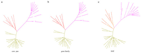 The species phylogenetic trees of Penicillium variabile HXQ-H-1 and other 33 Penicillium genomes. Trees were reconstructed based on core genes (a), homolog genes (b) and SNPs (c) respectively. The three clades are marked with different colors.