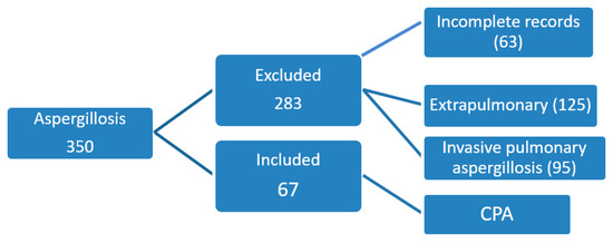 Iqbal N, Irfan M, Mushtaq A, Jabeen K. Underlying Conditions and Clinical Spectrum of Chronic Pulmonary Aspergillosis (CPA): An Experience from a Tertiary Care Hospital in Karachi, Pakistan. Journal of Fungi. 2020; 6(2):41. https://doi.org/10.3390/jof6020041