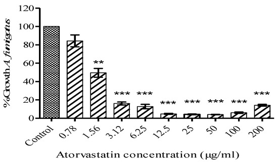 Effect of atorvastatin on growth of A fumigatus. A. fumigatus conidia (initial concentration 1 × 106/mL) were exposed to atorvastatin in SAB culture medium. Growth (%) was calculated by comparing atorvastatin-treated A. fumigatus to control cells after 48 h growth (** p < 0.01; *** p < 0.001).