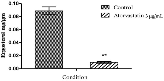 Ergosterol was extracted from mycelial exposed to atorvastatin as described and quantified by GC analysis. Exposure of A. fumigatus cultures to atorvastatin (3 µg/mL) for 72 h lead to a significant reduction in ergosterol production (Figure 2) (control = 0.088 ± 0.008 mg/g and atorvastatin-treated mycelia = 0.006 ± 0.0012 mg/g (p < 0.01).