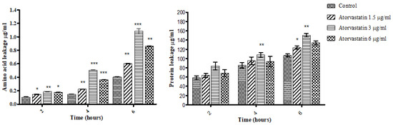 Effect of atorvastatin on the release of amino acids (a) and protein (b) from A. fumigatus. The effect of atorvastatin (3 μg/mL) on A. fumigatus amino acid and protein release was determined by a ninhydrin colorimetric assay and Bradford protein assay, respectively. Atorvastatin treatment resulted in increased amino acid and protein release relative to control cells (* p < 0.05; ** p < 0.01; *** p < 0.001).