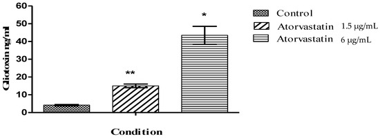 Atorvastatin exposure also induced an increase in the release of gliotoxin from A. fumigatus cultures (Figure 4). After 72 h growth at 37 °C gliotoxin was 14.04 ± 1.01 ng/mL at an atorvastatin concentration of 1.5 µg/mL compared to the control, which was 4.2 ± 0.6 ng/mL (p = 0.005). At an atorvastatin concentration of 6 µg/mL the gliotoxin concentration was 47.22 ± 5.06 ng/mL (p = 0.01).