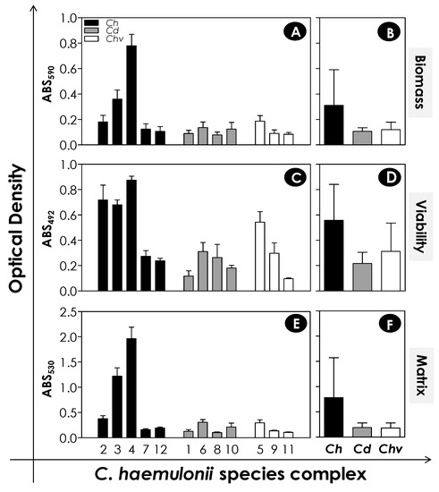 Biofilm formation by the C. haemulonii species complex on polystyrene surface. Yeasts (200 μL containing 106 cells) were placed to interact with polystyrene for 48 h at 37 °C. Afterwards, the systems were processed to detect fungal biomass by crystal violet incorporation in methanol-fixed biofilms at 590 nm, cell viability by the reduction of 2,3-bis (2-methoxy-4-nitro-5-sulfophenyl)-5-[(phenylamino) carbonyl]-2H-tetrazolium hydroxide (XTT) in formazan at 492 nm, and extracellular matrix by staining non-fixed biofilms with safranin at 530 nm. The results were expressed as absorbance (ABS) values per clinical isolate studied (A,C,E) and mean per fungal species (B,D,F). The results are shown as mean ± standard deviation of three independent experiments. The numbers on the X-axis of graphs represent each of the 12 clinical isolates of the C. haemulonii species complex studied, in which Ch means C. haemulonii, Cd means C. duobushaemulonii, and Chv means C. haemulonii var. vulnera.