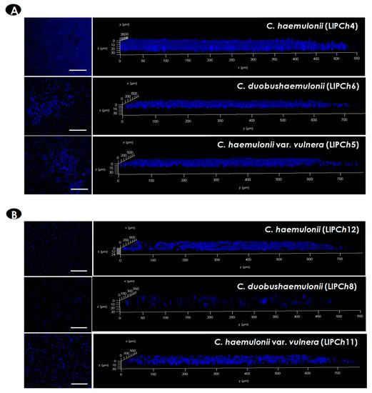 Representative confocal laser scanning microscopy (CLSM) images of the biofilms formed by the C. haemulonii species complex on polystyrene surface. Yeasts (200 μL containing 106 cells) were placed to interact with polystyrene for 48 h at 37 °C. Subsequently, the biofilms were stained with Calcofluor white, evidencing the fungal biomass. The panels on the left represent the top view images of the fungal biofilms visualized by CLSM; bars represent 5 µm. The graphs on the right represent the three-dimensional reconstruction of the biofilms formed by each species. The isolates C. haemulonii (LIPCh4), C. duobushaemulonii (LIPCh6), and C. haemulonii var. vulnera (LIPCh5), which formed the most robust biofilms (A), as well as the isolates C. haemulonii (LIPCh12), C. duobushaemulonii (LIPCh8), and C. haemulonii var. vulnera (LIPCh11), which formed the weakest biofilms (B), are shown.