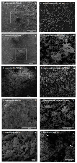 SEM analysis was used to assess the biofilm ultrastructure and to evidence peculiar morphological characteristics. Mature biofilms of C. haemulonii species complex consisted of a dense network of yeast cells, while structures similar to pseudohyphae were scarcely observed in the majority of the isolates studied (Figure 3). As seen through other approaches, isolate-specific differences were also visualized in biofilm ultrastructure. In this sense, the biofilms formed by C. haemulonii isolates LIPCh3 and LIPCh4, for example, exhibited a continuous, intimately packed multilayer structure (Figure 3A–E), while in the remaining fungal isolates, the biofilms were formed by a predominantly discontinuous monolayer with cell aggregates (Figure 3G–I). Water channels could also be visualized (Figure 3J), as well as ECM, as exemplified by isolates of C. haemulonii (LIPCh4), C. duobushaemulonii (LIPCh6), and C. haemulonii var. vulnera (LIPCh5) (Figure 4A,B,C, respectively).
