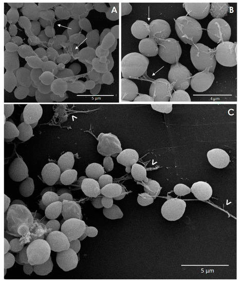 Representative high-magnification SEM images of the biofilms formed by the C. haemulonii species complex on polystyrene surface, focusing on the extracellular matrix (ECM). Yeasts (200 μL containing 106 cells) were placed to interact with polystyrene coverslips for 48 h at 37 °C, after which the coverslips were visualized using SEM. The ECM of biofilms of C. haemulonii LIPCh4 (A), C. duobushaemulonii LIPCh6 (B), and C. haemulonii var. vulnera LIPCh5 (C) are indicated by symbols. The images clearly reveal the presence of an ECM surrounding and holding the yeast cells together (white thin arrows) as well as connecting the yeasts with the polystyrene surface (white thick arrowheads).