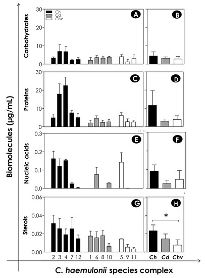 Main biomolecules forming the extracellular matrix (ECM) of the C. haemulonii species complex biofilms on polystyrene surface. Yeasts (200 μL containing 106 cells) were placed to interact with polystyrene for 48 h at 37 °C. After that, ECM was extracted and carbohydrates, proteins, nucleic acids, and sterols were quantified as detailed in methodology section. The results were expressed as concentration (µg/mL) of each biomolecule per clinical isolate studied (A,C,E,G) and mean concentration per fungal species (B,D,F,H). The results are shown as mean ± standard deviation of three independent experiments. The symbol (*) indicates p-values < 0.05 (one-way ANOVA, Tukey’s multiple comparison test). The numbers on the X-axis of graphs represent each of the 12 clinical isolates of the C. haemulonii complex studied, in which Ch means C. haemulonii, Cd means C. duobushaemulonii, and Chv means C. haemulonii var. vulnera.