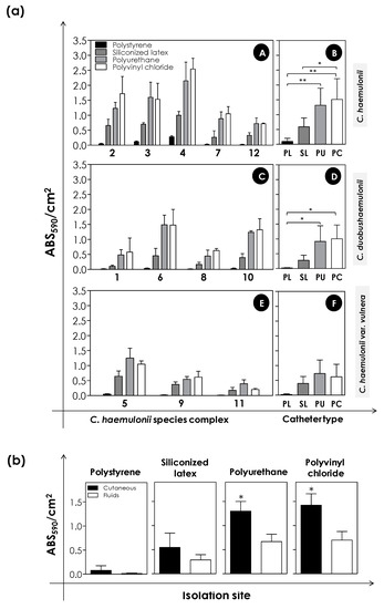 Catheter-related infections are considered a real problem in the medical arena around the world. Candidemia related to catheter use has already been reported in a variety of Candida species, including C. haemulonii species complex, resulting from the ability of this and other fungal pathogens to adhere to the catheter surface and, consequently, reach the bloodstream mainly of immunocompromised individuals [6]. For this reason, we decided to evaluate the C. haemulonii species complex biofilm formation capacity on the surface of different types of catheters currently used in the hospital environment—a latter bladder catheter made of siliconized latex, a nasoenteric catheter made of polyurethane, and a nasogastric catheter made of polyvinyl chloride. Biofilm formation on these materials was compared to that on polystyrene, a classical substratum used for biofilm analysis (Figure 1). The clinical isolates of the C. haemulonii complex were incubated for 48 h at 37 °C with the different materials and the biomass was measured by the incorporation of crystal violet. The results were expressed as absorbance (ABS590)/cm2, as the catheters have different dimensions. Our results stressed that the biofilm formation was significantly bigger over the different catheter types when compared with polystyrene regarding all the clinical isolates tested, demonstrating the risk that these clinical isolates would represent in the hospital settings, especially in individuals using nasogastric, nasoenteric, and urinary catheters (Figure 6(aA,aC,aE)). Additionally, biofilm formation on polyurethane and polyvinyl chloride catheters was comparable, with no significant differences between them (Figure 6(aA,aC,aE)). When comparing the mean biofilm formation per species of the C. haemulonii complex between the different substrates, we observed that the biofilms formed on polyurethane and polyvinyl chloride catheters were significantly bigger than on polystyrene for both C. haemulonii and C. duobushaemulonii. Further, biofilms formed on polyvinyl chloride catheters were significantly bigger than on siliconized latex only for C. haemulonii (Figure 6(aB,aD)), while for C. haemulonii var. vulnera, no differences were observed (Figure 6(aF)). Additionally, in relation to the isolation site, cutaneous (fungal isolates LIPCh2, LIPCh3, LIPCh4, and LIPCh7 of C. haemulonii; LIPCh1 and LIPCh6 of C. duobushaemulonii; and LIPCh5 of C. haemulonii var. vulnera) versus fluids (fungal isolates LIPCh12 of C. haemulonii; LIPCh8 and LIPCh10 of C. duobushaemulonii; and LIPCh9 and LIPCh11 of C. haemulonii var. vulnera) (Table 1), we observed that biofilm formation on the polyurethane (p = 0.0427, unpaired Student’st-test) and polyvinyl chloride catheters (p = 0.0472, unpaired Student’st-test) by the isolates from cases of cutaneous candidiasis was significantly higher when compared with isolates obtained from body fluids (Figure 6b). However, for polystyrene and siliconized latex catheters, no statistically significant differences (p > 0.05) were observed in this regard (Figure 6b).