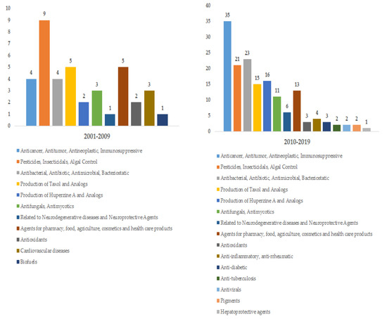 Early patents consisted mainly of registering the endophytic strains capable of producing specific compounds or those that represented a novel source of active metabolites (chanoclavine in EP1142986A2; resveratrol in CN1948459A; gallic acid in CN101280279A; taxol in CN101486974A) and very few applications. However, over time, patents were developed to include the registration of methods and procedures to produce and recover the compounds of interest (with a known biomedical application) or to optimize or increase their production (podophyllotoxin in US20040248265A1; taxol in CN1624103A; camptothecin in US20060134762A1; huperzine A in CN101275116A). In the last ten years, patents have been focused on using novel or enhanced fermentation processes to obtain high yields of products and provide possible applications for the metabolites (alpha-pyrone in CN110563740A; epimedins A–C in CN110511876A; differanisole A in CN109971655A; 5, 8-ergosterol epoxide in CN109971651A). The distribution of the patents in relation with the principal areas of application are illustrated in Figure 1. The production of taxol and huperzine A were considered as other application outside of their anticancer and anti-Alzheimer property respectively, due to the number of patents and economic importance.