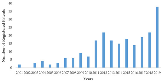 Number of registered patents from 2001 to 2019 linked to endophytic secondary metabolites and biotransformation processes through endophytic fungi.