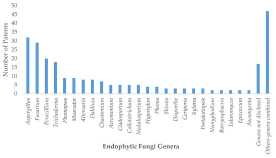 Fusarium and Penicillium were the most commonly registered endophytic fungi genera among the 21 patents reviewed for biotransformation processes. Figure 3 shows the number of patented genera. The most notable applications patented were antimicrobial, antibacterial, anticancer, and those related to neurodegenerative diseases. For biotransformation processes, the conversion of ginsenosides and glycyrrhizinic acid were the most patentable applications due to their importance and potential in the pharmaceutical and food industries.