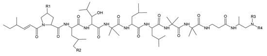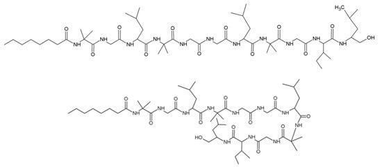 | AII b | T. longibrachiatum | Ac-Aib-Asn-Lxx-Lxx-Aib-Pro-Lxx-Vxx-Aib-Pro-Lxxol | [77] |
