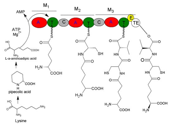 - Tahlan, K.; Moore, M.A.; Jensen, S.E. δ-(L-α-aminoadipyl)-L-cysteinyl-D-valine synthetase (ACVS): Discovery and perspectives. J. Ind. Microbiol. Biotechnol. 2016, 44, 517–524. [Google Scholar] [CrossRef] [PubMed]