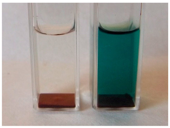 Formation of the green ABTS•+ by basidiospores of K. mutabilis in 1-cm cuvettes. Left, water control.
