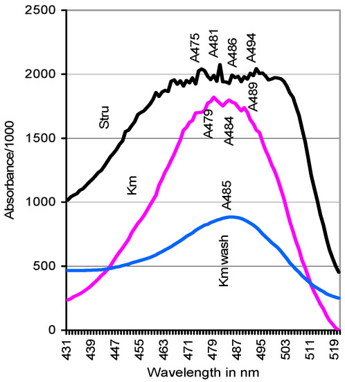 Absorbance spectra of carbohydrates displayed a single peak for hexose sugars at A485 for the first wash of both spore sources (Figure 3; compare Section 2.2). Internal carbohydrates of washed Stru spores showed uniformly high absorbance values from A475 to A480 for pentoses which passed over to A485 to A494 values for hexoses. Those of Kmt spores formed single peaks at A479 and A484.