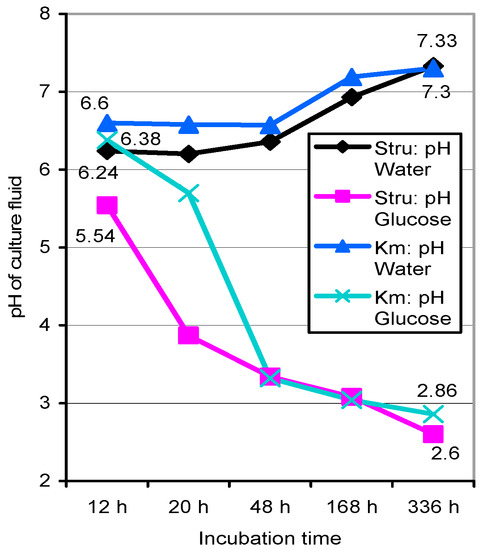 Incubating 4-mg samples of unwashed spores in 1-mL aliquots of bideionized water or a 5‰ glucose solution of high purity as above led to the acidification of the latter by non-germinated Stru > Kmt spores even within 12–20 h (Figure 4). Observation of the cultures over 14 d found the spores of Stru/Kmt united at pH 2.6/2.86 in glucose solution and alkalinized at pH 7.3 in water.