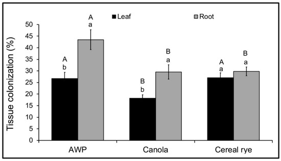 Percentage of root or leaf endophytically colonized in cover crops grown from M. robertsii-inoculated seeds of AWP (leaf n = 312, root n = 312), cereal rye (leaf n = 408, root n = 408) and canola (leaf n = 306, root n = 306). Error bars represent ± standard error of the mean. The lowercase letters show the difference between root and leaf colonization within a cover crop species. The uppercase letters show the differences among cover crop species where leaf or root tissues were analyzed separately. The bars sharing common letters are not significantly different at p = 0.05.