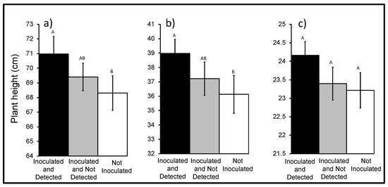 Height of ‘Inoculated and Detected’ or ‘Inoculated and Not Detected’ and ‘Not Inoculated’ (a) AWP (n = 111), (b) cereal rye (n = 142), and (c) canola (n = 99). Error bars represent ± standard error of the mean. The bars sharing common letters are not significantly different at p = 0.05.