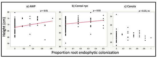 Relationship between the relative proportions of endophytic colonization of root tissue sections from which M. robertsii was recovered and height of (a) AWP, (b) cereal rye and (c) canola. No M. robertsii was recovered from non-inoculated control leaf and root tissue sections (data not shown). Regression lines for significant relationships between endophytic colonization and plant height are shown in red.