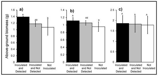 The above-ground dry biomass of ‘Inoculated and Detected’ (1.40 ± 0.02 g) AWP plants was greater than biomass of ‘Not Inoculated’ (1.07 ± 0.25 g) plants (p = 0.02, F2,87 = 3.94, n = 91), but was not different from the ‘Inoculated and Not Detected’ (1.18 ± 0.09 g) plants (Figure 5). Above-ground dry biomass of ‘Inoculated and Detected’ (1.11 ± 0.09 g) cereal rye plants was greater than the biomass of ‘Not Inoculated’ (0.95 ± 0.13 g) plants (p = 0.04, F2,109 = 3.12, n = 113), but was not different from the ‘Inoculated and Not Detected’ (1.06 ± 0.06 g) plants (Figure 5). The above-ground dry biomass of ‘Inoculated and Detected’ (1.86 ± 0.38 g) canola plants was not different than ‘Not Inoculated’ (1.78 ± 0.42 g) plants and the ‘Inoculated and Not Detected’ (1.83 ± 0.40 g) plants (p = 0.40, F2,71 = 0.92, n = 75) (Figure 5).