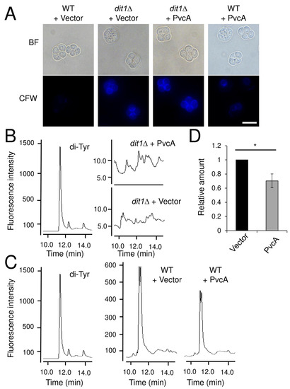 Although Dit1 is similar to isocyanide synthases, the product of Dit1 is not isocyanide-functionalized tyrosine. In wild-type cells, the amount of dityrosine was decreased with the expression of PvcA, probably because Dit1 and PvcA compete for the same substrate. The acceptor and donor substrates of PvcA are tyrosine and ribulose-5-phosphate, respectively [8]. Since the donor substrate for Dit1 remains unknown, it would be intriguing to test whether ribulose-5-phosphate is used as a substrate for Dit1.