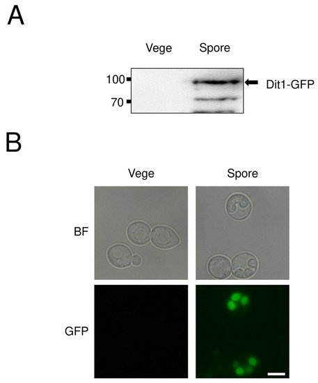 Analysis of Dit1 localization. (A) A diploid strain in which the chromosomal DIT1 genes were fused to GFP. Vegetative growing cells (Vege) and spores of the DIT1-GFP harboring cells were lysed and subjected to Western blotting analysis using anti-GFP antibodies. (B) Vegetative growing cells (Vege) and spores of the DIT1-GFP harboring cells were observed by bright field (BF) and florescence microscopy (GFP). Bar, 5 µm.
